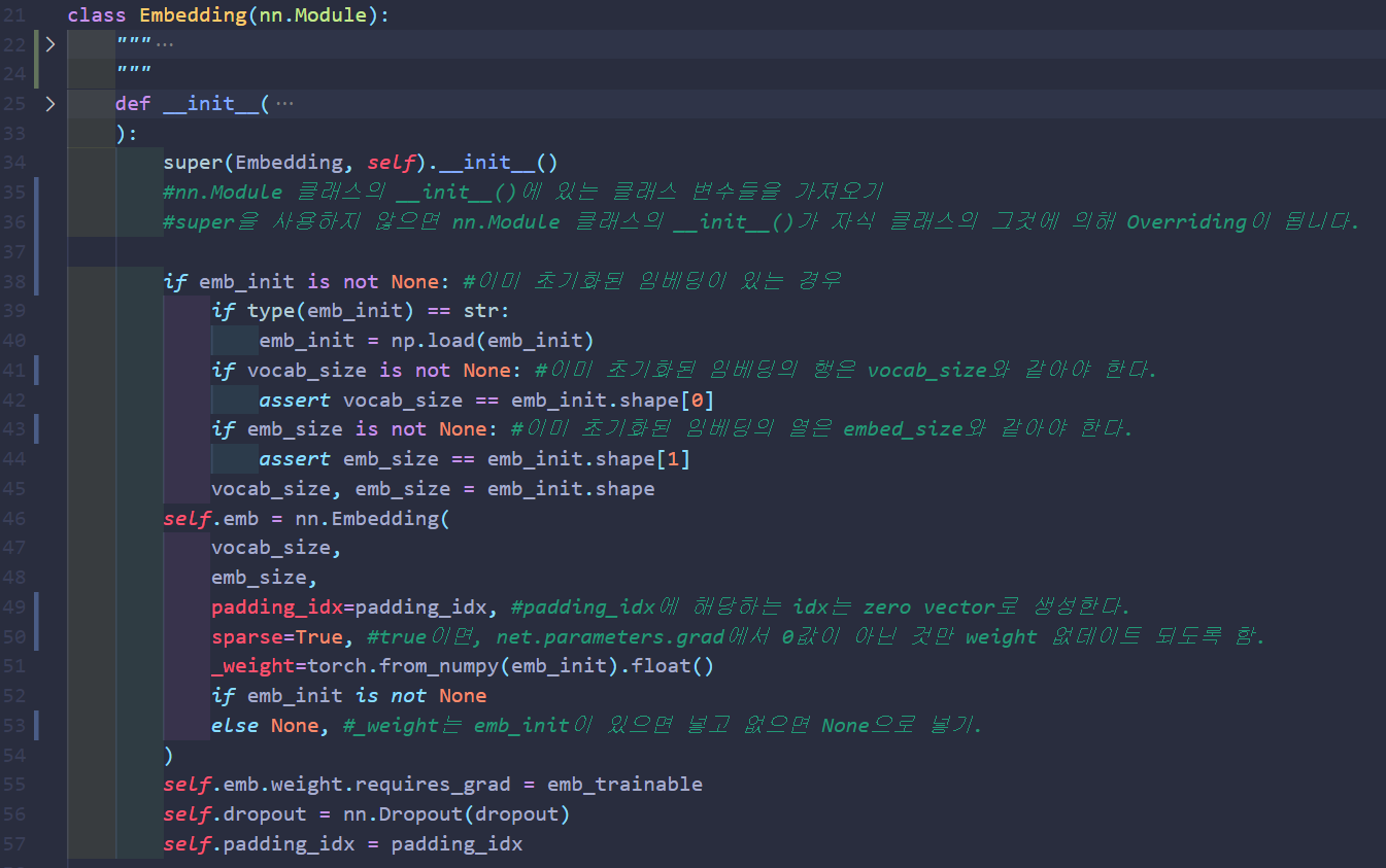 위 코드에서 제가 주목한 점은 nn.Embedding으로 self.emb 변수를 초기화하는 46번 줄의 코드입니다.