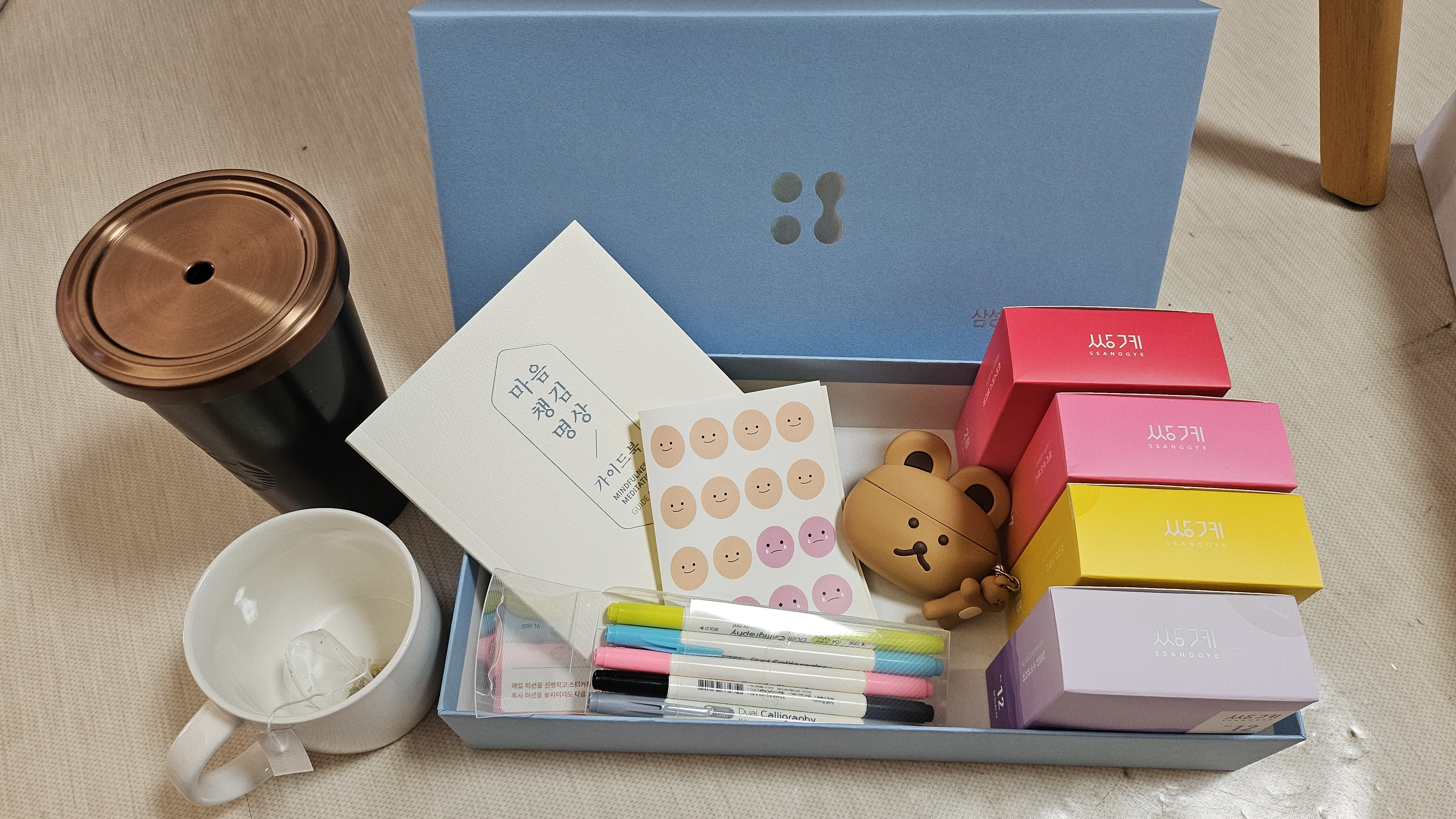 교육 전에 명상 키트가 집으로 배달이 되는데, 명상 매트, 찻잎, 싸인펜, 엽서, 스티커, 명상 안내서, 견과류 팩이 왔다.