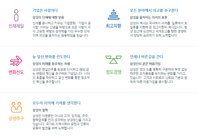 삼성의 경영 철학 및 핵심 가치를 배우고, 동기들와 친해질 수 있는 여러 가지 팀 빌딩 시간을 갖고, 스스로를 성찰할 수 있는 여러 활동들이 있었다.