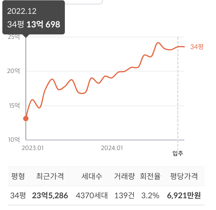 현재 34평 기준으로 23.5억으로 기록되며 올해 초 19억 매매가보다 4억이 더 올랐다.