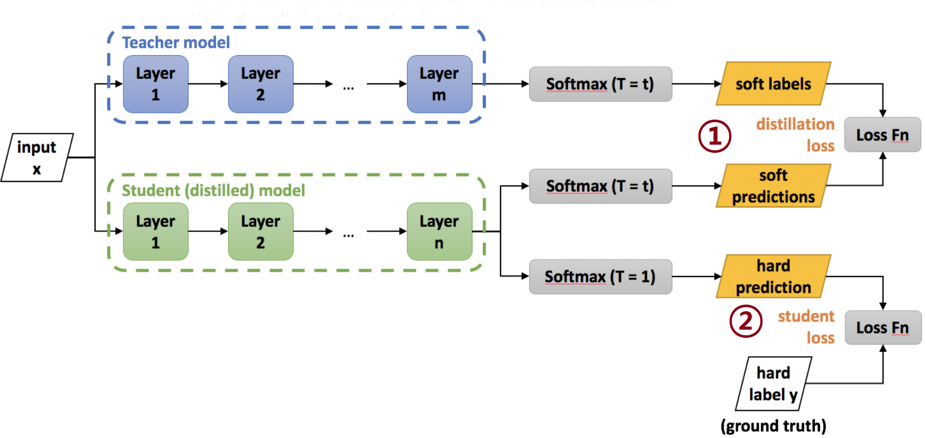 먼저 teacher model(T)을 학습한 후, 손실함수를 이용하여 T가 학습한 지식을 student model(S)에 넘긴다.